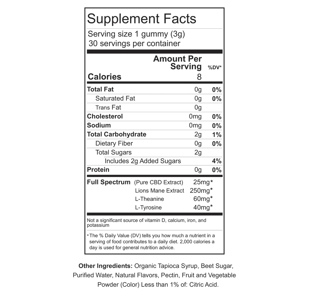 Organic Tapioca Syrup, Pure Beet Sugar, Natural Fruit Flavoring, Pectin, Citric Acid, Lion’s Mane, CBD Isolate, L-Theanine, and L-Tyrosine.